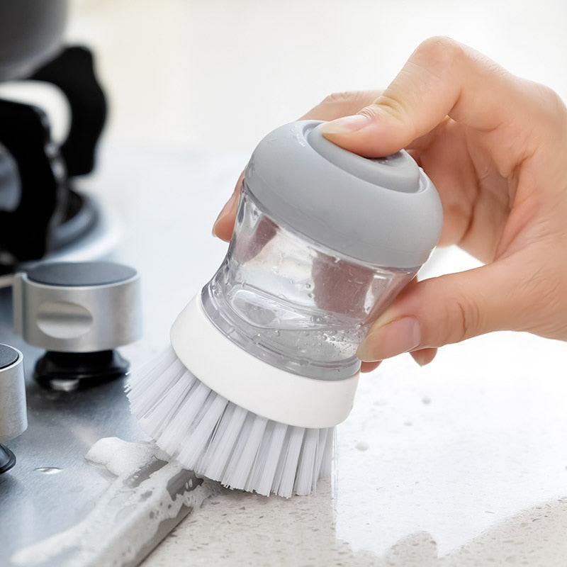 Brush dispenses soap with the light push of a button Brush has durable nylon bristles that easily scrub away baked-on food and is safe for non-stick cookware