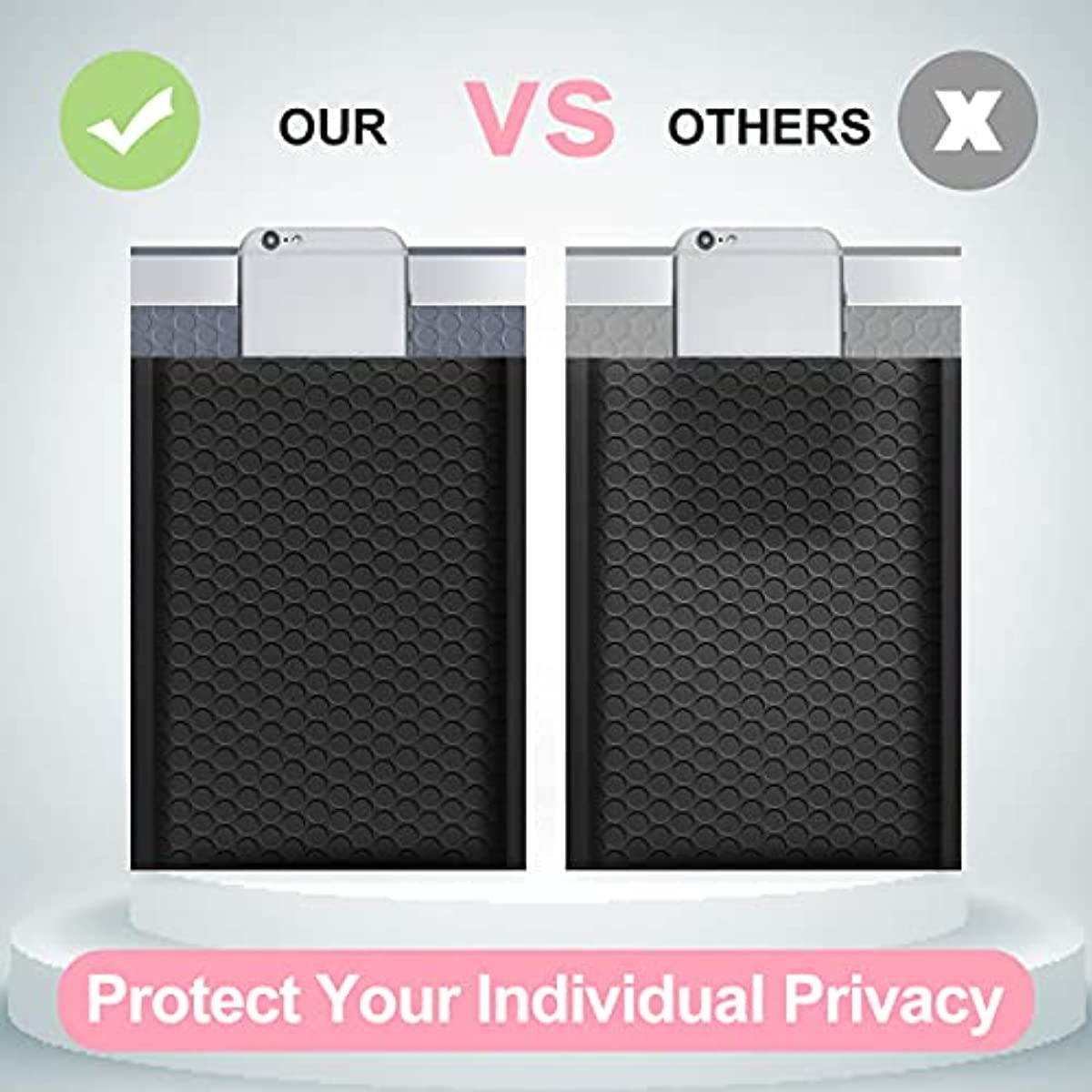 - Opaque Poly Bubble Mailers The black bubble mailers outer size is 4x8 inch while the inner size is 4x7 inch With full air bubbles our bubble mailers can protect your value products from damage caused by external impacts The inner lining is using gray film even if there is strong light the items in the bag cannot be seen which can protect your privacy well